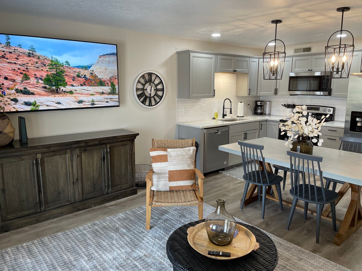 Sauberer, komfortabler Aufenthalt! 11 Minuten zum Snow Canyon State Park, 10 Minuten zum Tuachan Amphitheater! Nicht weit zum Zion-Nationalpark. 1. Schlafzimmer – Queensize-Bett, Kleiderschrank, Leseecke, zusätzlicher Stauraum. 2. Schlafzimmer – Queensize-Bett/Etagenbetten. Badezimmer – Badewanne/Dusche, Waschmaschine/Trockner. Die Küche ist klein, aber praktisch – Kühlschrank, Spüle, Toaster, Mikrowelle, Kochplatte, Kurik usw. Wohnbereich – Liegesofa, Drehstuhl, Smart-TV, elektrischer Kamin und Schreibtisch/Spiegel. *Update* ~ sofortiges heißes Wasser!