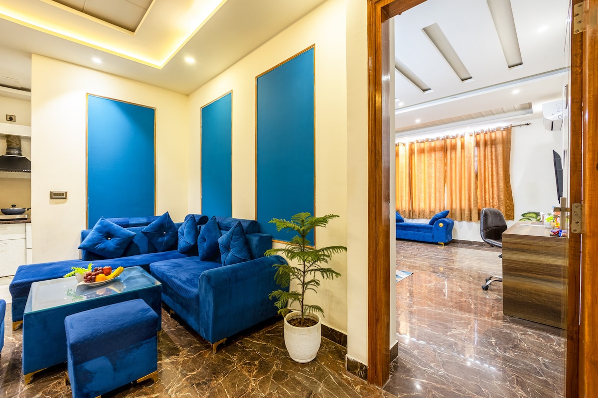 BLUO STAYS – Preisgekrönte Unterkünfte! Tolle 1BHK Suite (550 sq ft) in der Nähe von Udyog Vihar, DLF CyberCity & MG Road mit Aufzug & 100 % Power Backup. Arbeiten von zu Hause aus – Designer-Kingsize-Bett, 42-Zoll-Smart-TV, Badezimmer und eigener Balkon. Du erhältst auch ein separates Wohnzimmer mit Couch und Esstisch sowie eine Küche mit Kochfeld, Kühlschrank, Mikrowelle, Kochgeschirr usw. All-inclusive Tagesmieten – WLAN-Internet, Netflix/Prime, Reinigung, Waschmaschine, Nebenkosten, Parkplatz, Aufzug, Fitnessraum, Tischtennis, Billardtisch und Terrassengarten.
