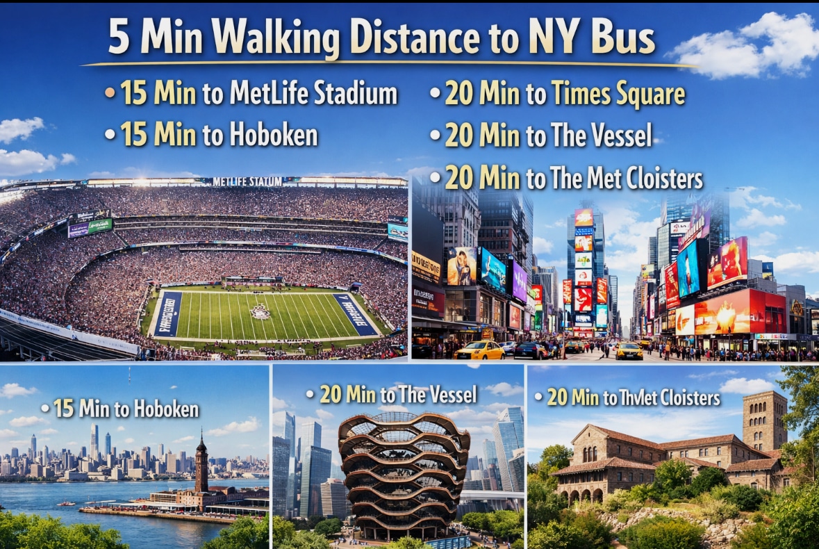 Willkommen bei EV Dream Stays! Unser 2BR North Bergen Haven ist nur wenige Minuten von NYC, MetLife, MSG, Prudential Center, Red Bulls Arena, World Trade Center und American Dream entfernt. 🔌EV READY: Level 2 Aufladen (20 US-Dollar/Tag) + Tesla-Adapter! Kostenloser Privatparkplatz. 🏡DER RAUM: 2 SCHLAFZIMMER/1 BADEZIMMER, voll ausgestattete Küche sowie ein riesiger Garten mit Grill und Feuerstelle. 📍TRANSIT: 2 Blocks zum NYC-Bus (35 m zum Times Sq/Freiheitsstatue). ⚠️WICHTIG: Einheit auf Gartenebene, niedrige Decken (max. 6'). Familienhaus; tagsüber sind Schritte von oben zu erwarten.