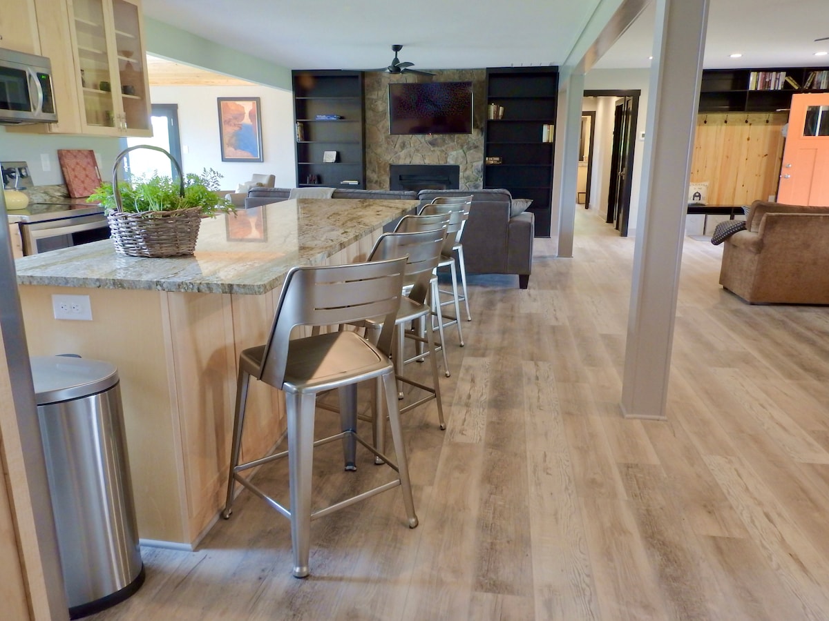 Wenn du auf der Suche nach einem ruhigen Landhaus auf einem bewaldeten 2,5 Hektar großen Grundstück bist, dann brauchst du nicht weiter zu suchen. Diese Unterkunft mit 2 Schlafzimmern (3 Betten) und 2 Badezimmern bietet den gleichen Komfort wie zu Hause, einschließlich einer voll ausgestatteten Küche, einem Essbereich, einem Spielzimmer, einer Waschküche, einer überdachten Terrasse und einer Garage für ein Auto. Außerdem stehen Parkplätze im Freien zur Verfügung. Hänge drinnen ab und spiele auf unserem Billardtisch, unserer Dartscheibe, unserem Tischfußballtisch, unseren Spielen, unseren Puzzles oder genieße die Natur, indem du S'mores über der Feuerstelle machst oder die Hängematte genießt. Schau dir unseren Reiseführer an!