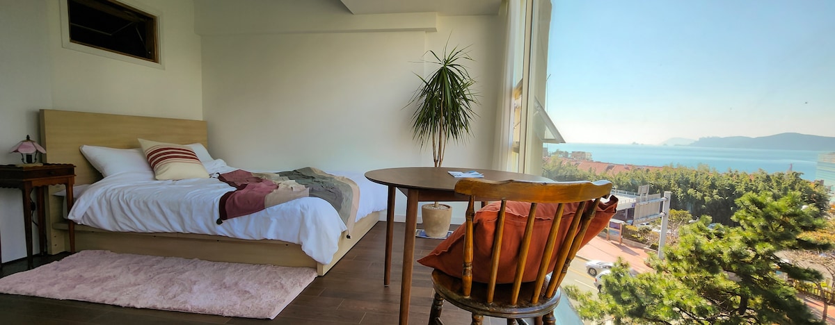 [Haeundae Gamsung 1st] Meerblick # 2 Zimmer 2 Queensize-Betten # Meer & Blueline Park 2 Minuten zu Fuß # Küche # Waschmaschine # Großer Balkon
