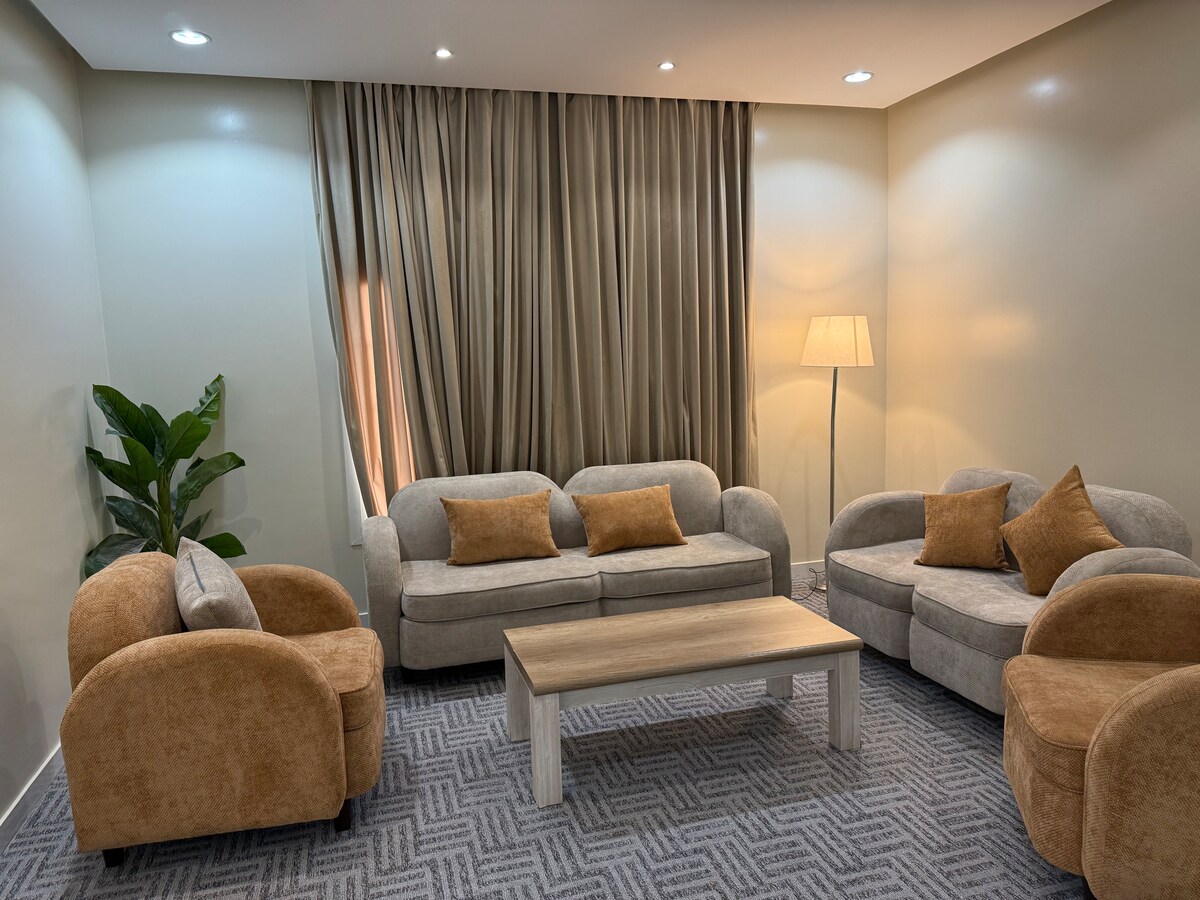 Ein Studio mit einer unverwechselbaren Lage und einem Live-Bereich direkt hinter der Al-Othaim Mall, dem größten Einkaufszentrum in Hail, das zu Fuß erreichbar ist, und in der Nähe der Fahad Street, wo es die berühmtesten Restaurants und bekannten Cafés und in der Nähe aller grundlegenden Dienstleistungen gibt, ist nur eine 9-minütige Fahrt vom Flughafen Hail entfernt. Kostenloser Internetzugang und ein Smart-TV-Bildschirm mit allen Anwendungen. Es gibt eine Mikrowelle, einen Kühlschrank und einen Hotelkocher