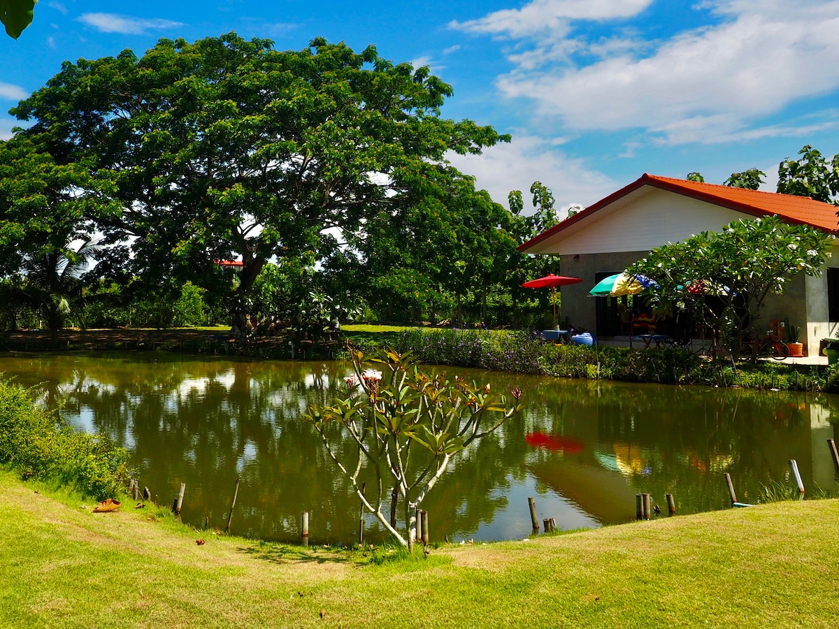 Erlebe Thailand, das die meisten Touristen nie sehen! Genieße die persönliche Note in unserem geräumigen Teebaumhaus in einer malerischen ländlichen Umgebung mit einer Terrasse, Rasenflächen, Obstbäumen und einem großen Teich, aber nur eine halbe Stunde vom Flughafen und dem Stadtzentrum entfernt. Entspannen, langsamer, neu starten! Genieße unsere Dusche im Freien, frühstückst am Teichrand, beobachte die Vögel, lies, male, lerne, thailändisches Essen mit Gastgeber Air zu kochen, erkunde die lokalen Tempel, Märkte und das Landleben: Zeit, dich zu erholen und zu verjüngen!