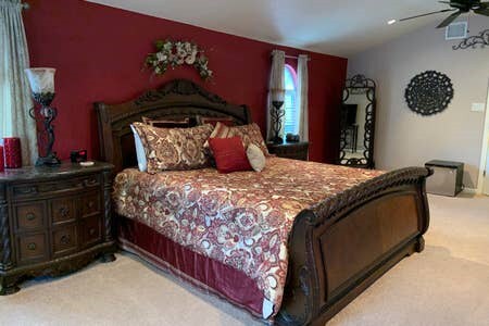 Hallo, unser hübsches Zimmer mit Pfau-Motiv verfügt über ein Queensize-Bett mit zusätzlichen Kissen/Decken, TV mit Roku, Xfinity-Stream, schnelles WLAN, großen Minikühlschrank, UV-C-Luftdesinfektionsmittel, begehbaren Kleiderschrank, Kommode, Schrank, schlüssellose Schlösser und jede Menge andere Extras! Zugang zu angeschlossenem 1/2 Bad im Erdgeschoss, Vollbad im Obergeschoss und Waschmaschinen-/Trocknerzugang. Kostenloses Selbstbedienungsfrühstück mit Kaffee, Tees, warmen/kalten Müsli, Bagels, Obst. Wasserflaschen im Zimmer und Snacks verfügbar. Keine Sperrstunde nach dem Check-in.