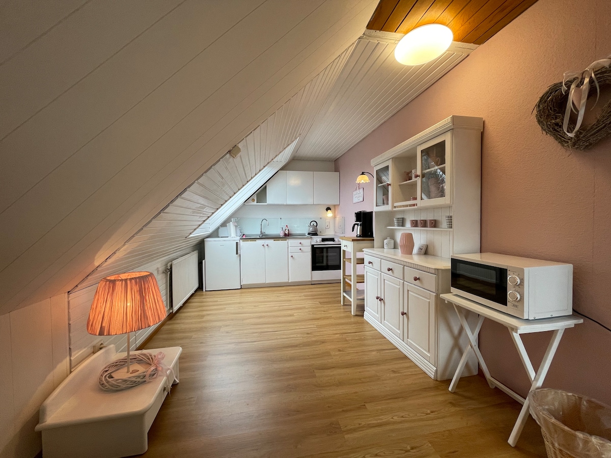Wir vermieten in unserem Wohnhaus nur die Ferienwohnung im Obergeschoß. Sie gelangen über eine Treppe zum separaten Eingang zum Obergeschoß unseres Hauses, in dem Ihnen ein großer kombinierter Wohn- und Essbereich, ein separates Schlafzimmer sowie ein Bad mit WC und Dusche zur Verfügung stehen. Die Größe der Ferienwohnung beträgt etwa 50 qm.