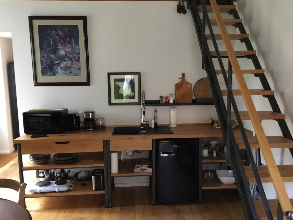 In zentraler und dennoch ruhiger Lage könnt ihr im Anbau meiner alten Stadtvilla ein 55m2 großes Studio mieten. Hier findet ihr eine Küche mit angrenzendem Essplatz und Wohnbereich inkl. hochwertiger Schlafcouch, einen kleinen Arbeitsbereich mit Schreibtisch, ein minimalistisches Bad und ein gemütliches Schlafzimmer mit Blick in den Garten.