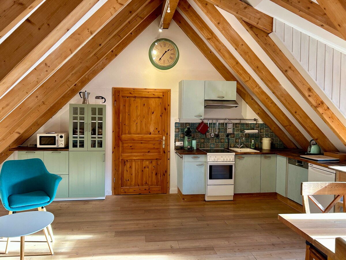 Die ehemalige Gesindekammer des ursprünglichen Bauernhofes wurde von uns liebevoll zu einer geräumigen Dachgeschoßwohnung ausgebaut. Die bis in den Giebel ausgebaute Wohnung strahlt einen ganz besonderen Charme aus. In der 75qm-Wohnung gibt es ein Schlafzimmer mit Doppelbett und Babybett und einen großen Wohnraum mit offener, voll ausgestatteter Küche. Das moderne Badezimmer hat eine ebenerdige Dusche mit Wandheizung.