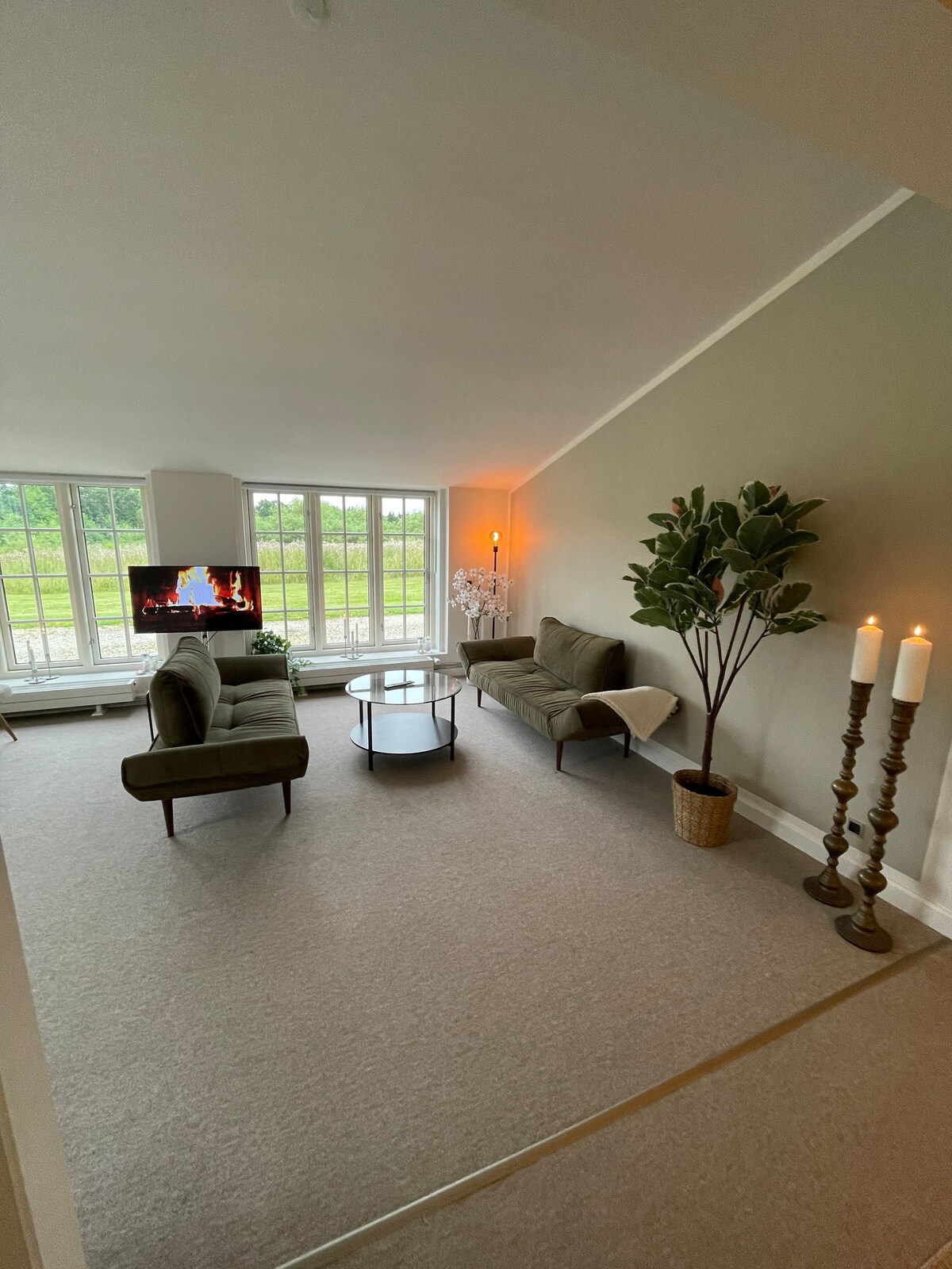 Diese Naturperle liegt nördlich von Helsinge in Kongernes Nordsjælland mit Blick auf offene Felder und Wälder. Es sind 200 m bis zum Wald, wo es gute Chancen gibt, Pilze zu sammeln oder einfach nur in der schönen Natur spazieren zu gehen. Es ist sehr üblich, dass die Tiere des Waldes direkt vor den Fenstern vorbeiziehen. Es können zum Beispiel Rehe, Damhirsche und Hirsche sein. Sie können Ihr Elektroauto bei uns aufladen. Wir haben separate Stromzähler, so dass die Abrechnung nach den Tagespreisen erfolgt, die an anderen öffentlichen Ladestationen zu finden sind.