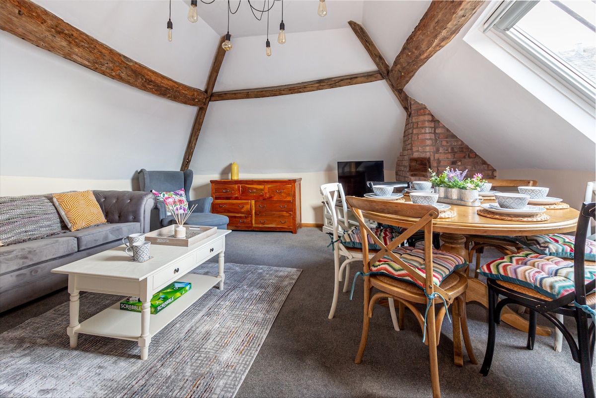 Eine große Wohnung in einem schönen, ruhigen Edwardian-Haus mit herrlichem Blick auf die Kathedrale von Hereford und die walisischen Berge. Ein toller Ort zum Erkunden oder einfach nur zum Entspannen. Genieße an einem Sommerabend einen Drink auf dem Balkon und kuschel dich im Winter am Holzofen. Die Wohnung ist nicht ideal für sehr späte Nächte und ist nicht sicher für Kinder oder Haustiere. Tee, Kaffee und grundlegende Frühstücksartikel werden bereitgestellt.