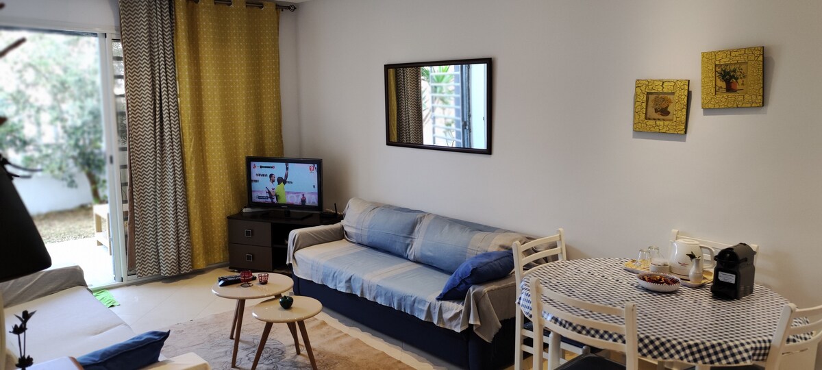 Gemütliche &Top Wohnung auf der Meerseite, besteht am Eingang aus einem großen Wohnzimmer mit Blick auf einen schönen, gut eingerichteten privaten Garten, internationale TV-Kanäle, (TF1,M6 usw.), Schlafzimmer mit Doppelbett, Bad, gut ausgestattete Küche, Klimaanlage warm und kalt, mit einem Parkplatz vor der Residenz, der nur aus 6 Wohnungen und in der Nähe aller Annehmlichkeiten besteht Bus, Taxi Eine der besten Optionen für Hergla