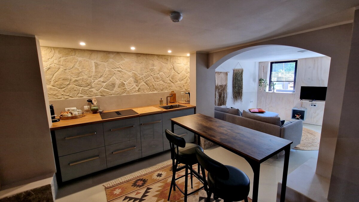 De hele benedenverdieping van deze ark op de Rijn behoort tot uw domein: een gezellige woonkeuken verbonden door een hal met de woonkamer. Zowel de woonkamer als de keuken zijn voorzien van een houtkachel, naast vloer- en wandverwarming. De keuken is voorzien van 6 pitsgasfornuis, een grote oven, koel- en vrieskast, vaatwasser en div apparatuur. Het designbed staat in de woonkamer. Op uw prive-terras bevindt zich de buitendouche. In de tuin met uitzicht over de Rijn diverse zit en bbq plekken.