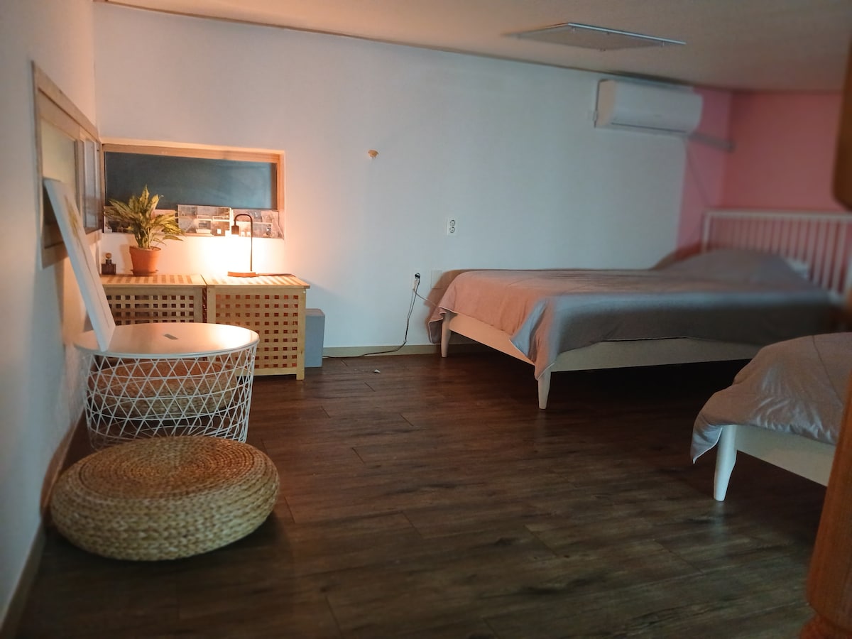 Dies ist ein Mischenzentrum in Sachang-Intersection, Chungbuk-Universität, Cheongju. Es ist sehr praktisch, da es in der Nähe von Geschäftsvierteln, Convenience-Stores, Märkten, Bushaltestellen und verschiedenen anderen Annehmlichkeiten ist. Dies ist eine trendige Unterkunft mit einzigartigem Farbspiel und modernem Mid-Century-Design. Einfacher und moderner Raum in Weißton!! Mit einer farbenfrohen Persönlichkeit habe ich die Eigenschaften von Mid-Century hervorgehoben. Mit Requisiten in kräftigen Farben wie Senf, Olivgrün und Orange wird der Raum einfach und einzigartig. ++ Allein der Aufenthalt in der Unterkunft verbessert die Stimmung :) Queensize-Bett + 1-Personen-Topper für 3 Personen möglich Ausgestattet mit einem mobilen Stand-Smart-TV, auf dem Netflix-Streaming möglich ist Musik hören ok mit Bluetooth-Lautsprecher Eine andere Lichtinszenierung sorgt für eine bessere Stimmung beim Date Genießen Sie eine komfortable Erholung in einem einzigartigen Zimmer mit trendigem Stil :)