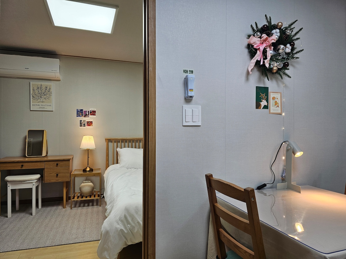 Stilvolles und komplett privates Studio (38 m²) Als „Zimmer“ registriert, aber als völlig unabhängige Einheit genutzt Privates Badezimmer, Waschmaschine im Zimmer, Küche; Trockner auf dem Dach verfügbar In einem 6-stöckigen Gebäude mit Aufzug. 7 Gehminuten zur Station Cheongnyangni (KTX/ITX) In der Nähe eines Supermarkts und eines traditionellen Marktes Einfacher Zugang zu öffentlichen Verkehrsmitteln und nahegelegenen Universitäten Der Manager vor Ort sorgt für eine saubere und gepflegte Umgebung Ideal für Austauschstudent:innen, Praktikant:innen, Langzeitaufenthalte