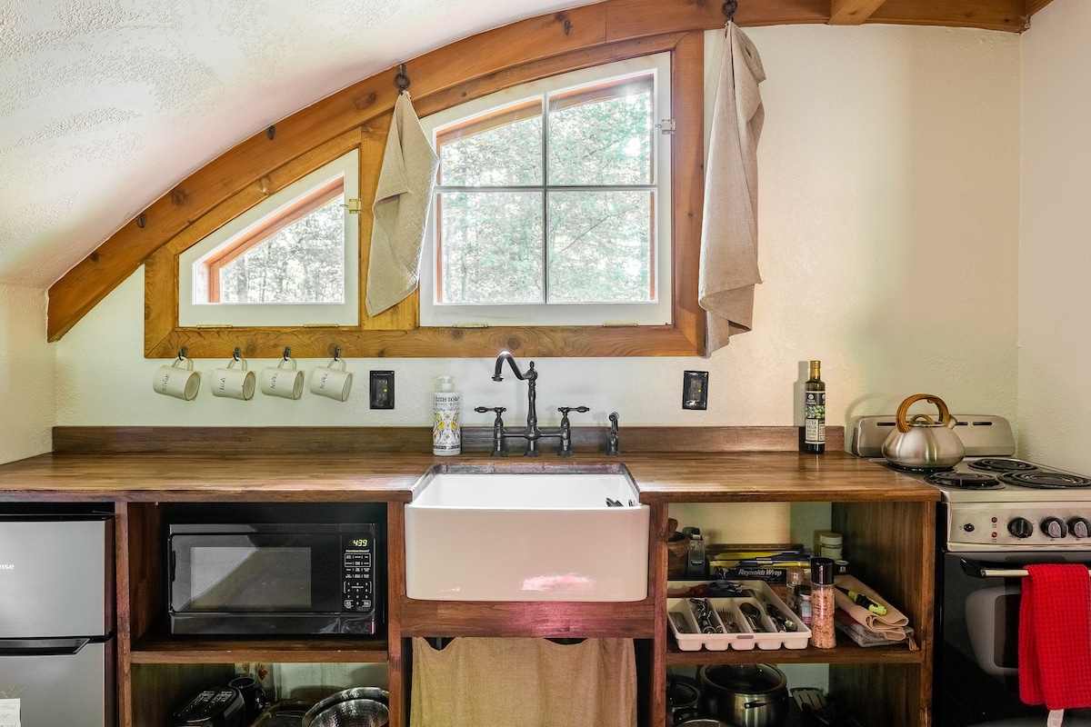 Wee Nook ist ein 360 Quadratfuß großer Wohnraum mit voll ausgestatteter Küche und Badezimmer. Es ist mitten im Wald unterirdisch versteckt. Bitte komm und genieße den Wald, die Nutztiere, die Wanderwege, den Teich und die weiten, offenen Räume, während du hier bist! Wie JRR Tolkien sagte: „In einem Loch im Boden lebte ein Hobbit. Kein böses, schmutziges, nasses Loch, gefüllt mit den Enden von Würmern und einem schleimigen Geruch, noch ein trockenes, kahles, sandiges Loch ohne nichts zum Hinsetzen oder Essen: Es war ein Hobbit-Loch, und das bedeutet Komfort.“