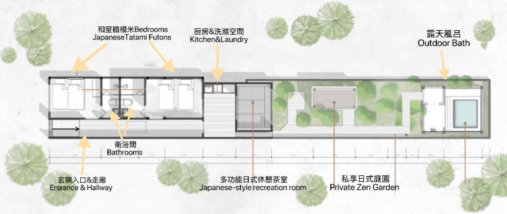 "TABITABI KANOE MITSU" ist eine Unterkunft für eine Gruppe pro Tag in einem komplett renovierten, über 100 Jahre alten Kyomachi-Haus direkt neben dem Ritsurin-Tempel. Wenn Sie vom Eingang aus einen Blick in den Hintergrund werfen, sehen Sie einen Garten, der sich hinter dem Schneeschutzgitter ausbreitet. Ein großer Palmenbaum ist charakteristisch für den Garten. Wenn Sie das Fenster vom Wohnzimmer aus öffnen, lädt das halb-offene Badezimmer, das direkt mit dem Garten verbunden ist, die Gäste unabhängig von der Jahreszeit zu einem erstklassigen Heilbad ein. Die Badewanne besteht aus Shigaraki-Yaki-Keramik, die in einem Ofen in der Präfektur Shiga hergestellt wurde. Durch die Wirkung von fernem Infrarotlicht wärmt es den Körper bis ins Mark und hält das Wasser länger warm. Wie wäre es, wenn Sie die Müdigkeit des Tages heilen, während Sie den langen Lauf der Zeit spüren, einen Blick auf den schönen japanischen Garten werfen und ein Glas Sake trinken? Im japanischen Zimmer im 2. Stock befindet sich ein Shoji-Raum mit einem Design im Stil des Mondrian-Musters. Das Kopfteil des Schlafzimmers ist so gestaltet, dass es an die Tōyama-Gebirgskette erinnert. Vergessen Sie den Alltagsstress und entspannen Sie sich.