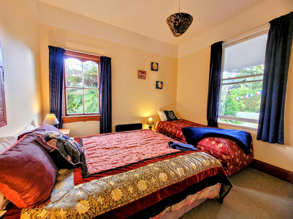 We offer a place like no other. The Mamaku Roost is a large, unique, private & peaceful oasis with easy access/parking in a semi rural setting (but super handy location) 5 minute drive to town, train & beach. Art, antiques, original wooden floors, log burner, double glazing/curtains, modern hot shower, heated blankets, kitchenette, fast wifi, black out curtains. Outside has a covered patio, outdoor fire/furniture, fountain, native bush, farm, garden, beehives, friendly animals. Guests say WOW.
