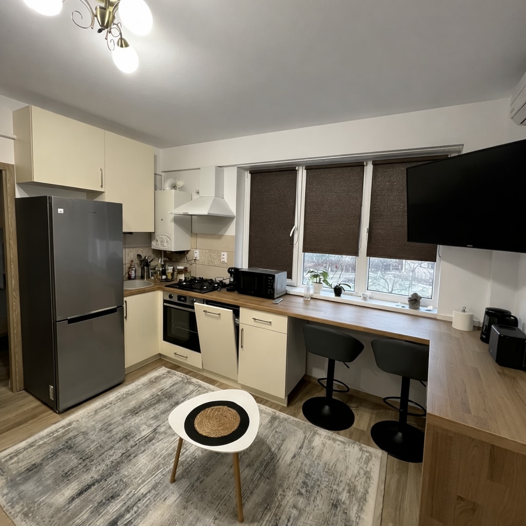 Helle 2-Zimmer-Wohnung in neutralen Tönen, mit einem großen Bett und einem geräumigen Badezimmer mit Badewanne. Küche und Wohnzimmer offen zu einem Balkon mit Tisch und Stühlen, perfekt für den Blick auf die Stadt. Viel Stauraum und eine hohe Etage. Nur wenige Minuten von Sf. Maria Hospital, Nicolae N. Oblu Hospital, Iulius Mall und Palas Mall – ideal für entspannende Aufenthalte oder Erkundung von Iași.