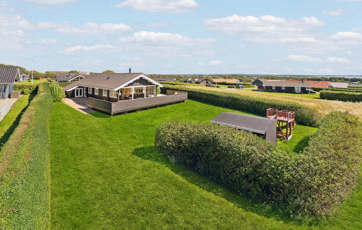 Für eine große Familie oder mehrere Familien ist dieses Ferienhaus eine naheliegende Wahl. Das Haus ist mit 18 Schlafplätzen auf beiden Etagen des Hauses, zwei Küchenbereichen mit Essbereichen, drei Wohnzimmern, zwei Badezimmern und einer Gästetoilette, einem Aktivitätsraum mit Bar, mehreren Balkonen, einem Whirlpool, einer Sauna und einem schönen, ungestörten Garten mit einem kleinen See ausgestattet. Das Ferienhaus befindet sich nicht weit vom Leuchtturm Bovbjerg entfernt und bietet einen schönen Nanture- und Meerblick.