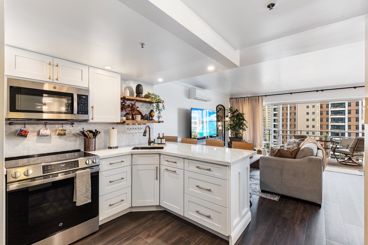 Renovierte moderne Wohnung / Studio in zentraler Lage in Waikiki, auf der 8. Etage des Marine Surf Waikiki Building mit KOSTENLOSEN PARKPLÄTZEN an einem privaten Stand. Das Gebäude liegt günstig auf der Straße von Luxury Row und dem berühmten Royal Hawaiian Shopping Center und International Marketplace. An der Seaside Avenue gelegen, einer Straße, die senkrecht zum Abschnitt der Kalākaua Avenue verläuft – Waikiki Beach, Hotels, Einkaufsmöglichkeiten, Restaurants und Cafés.