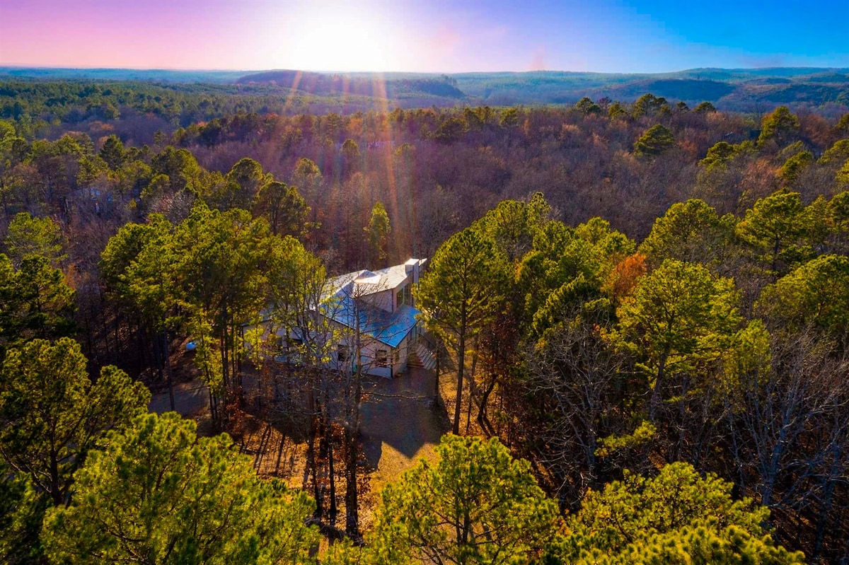 Gehöre zu den Ersten, die in dieser schönen neuen Hütte übernachten! ***GEPAVIMERTE STRASSE den ganzen Weg zur Hütte. KEIN ALLRAD/GETRIEBENRADANTRIEB für den Zugang wie bei anderen erforderlich** Suchst du nach einem romantischen Kurzurlaub? Whiskey Pines könnte die Hütte für dich sein. Diese gemütliche Hütte im wunderschönen Wald der Ouachita-Berge bietet dir ein Erlebnis, das du nie vergessen wirst. Diese Hütte hat einen offenen Grundriss mit Glasfenstern, die die gesamten 20 Fuß hohen Decken hinaufreichen. Die atemberaubende private Terrasse erinnert an ein Baumhaus, das von Kiefern umgeben ist.