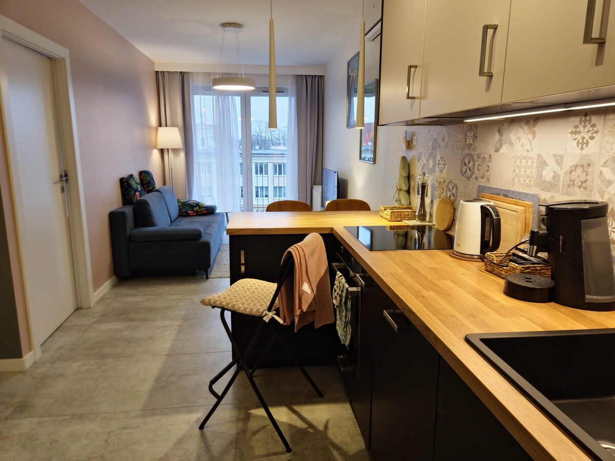 Stilvolles Apartment im Zentrum von Breslau. Zwei Doppelbetten, TV, WLAN, HBO Max, Klimaanlage; Badezimmer mit Dusche und Haartrockner, Handtücher. Küche mit Induktionskochfeld, Geschirrspüler, Waschmaschine mit Trockner, Mikrowelle und Kaffeemaschine. Ausgestattet mit dem notwendigen Geschirr und Besteck. Im Flur ein Kleiderschrank mit Kleiderbügel und Schubladen, Bügeleisen und Bügelbrett.