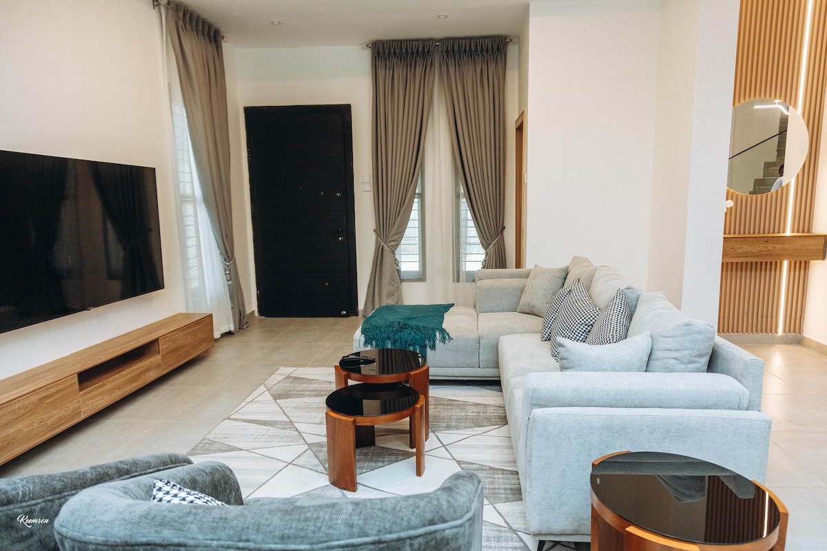 Entfliehe in Olumides ruhige Oase im Herzen der Stadt! Unsere luxuriöse 3-Bett-Wohnung mit 33Kva-Transformator garantiert eine ununterbrochene Stromversorgung. Entspanne dich stilvoll mit unseren gemütlichen King-Size- und zwei Queensize-Retreats mit jeweils eigenem Bad für ultimativen Komfort. Bleibe mit schnellem WLAN, das von einem Standby-Generator unterstützt wird, in Verbindung! Netflix mit unseren 65- und 42-Zoll-Smart-TVs, voll ausgestatteter Küche und privaten Balkonen. Perfekt für Langzeitaufenthalte, Familien und Gruppen. Buche jetzt & entspanne dich stilvoll