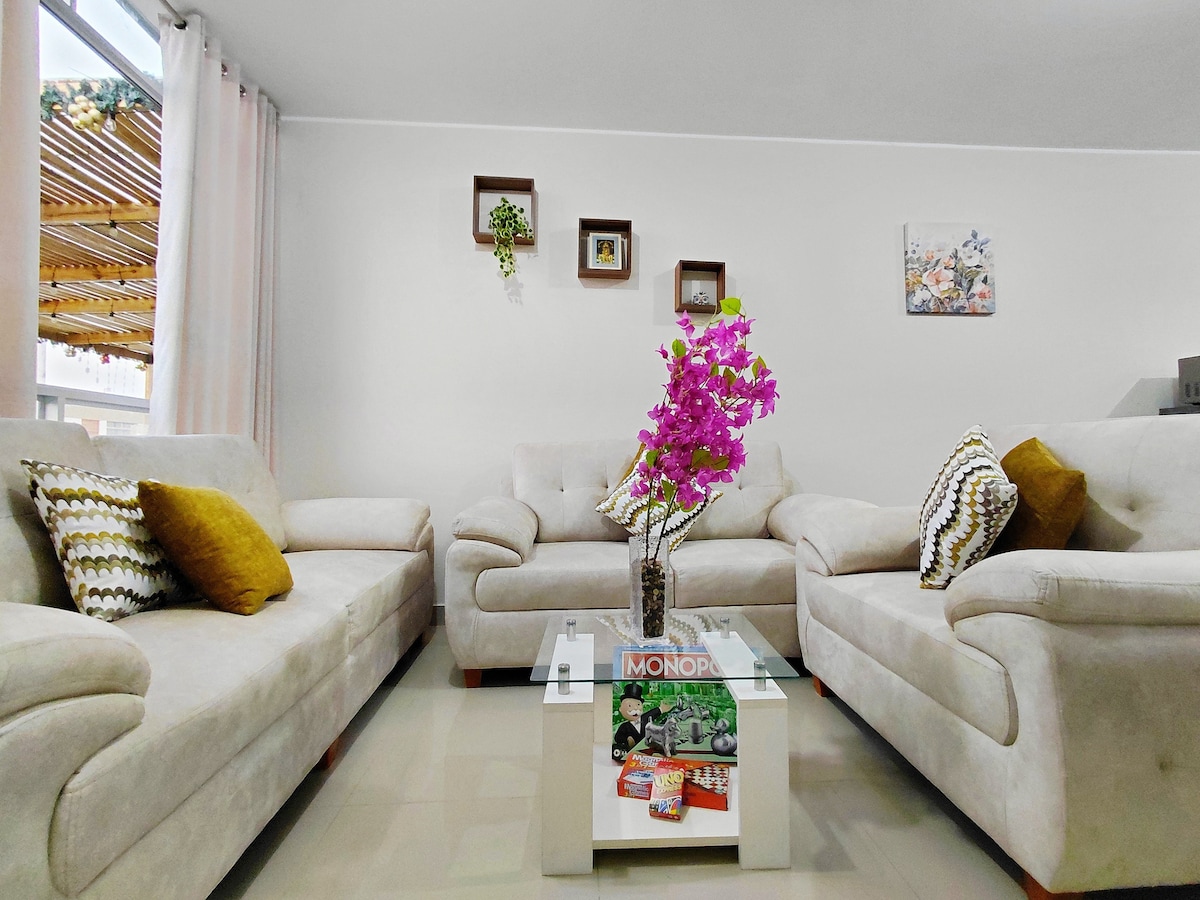 Genieße den Komfort und die unschlagbare Lage unseres Hauses, ideal für Familien oder Gruppen von Freunden. Wir befinden uns in einer zentralen Gegend, nur eine 4-minütige Fahrt vom Hauptplatz von Ica entfernt, wo du die Kathedrale, die Gemeinde und eine lebendige Atmosphäre findest. Darüber hinaus ermöglicht es dir die Nähe zu einem lokalen Markt, das Leben in Ica zu erleben und dich leicht einzudecken. Die Unterkunft verfügt über: 3 Schlafzimmer und 2 Badezimmer und ist voll möbliert.