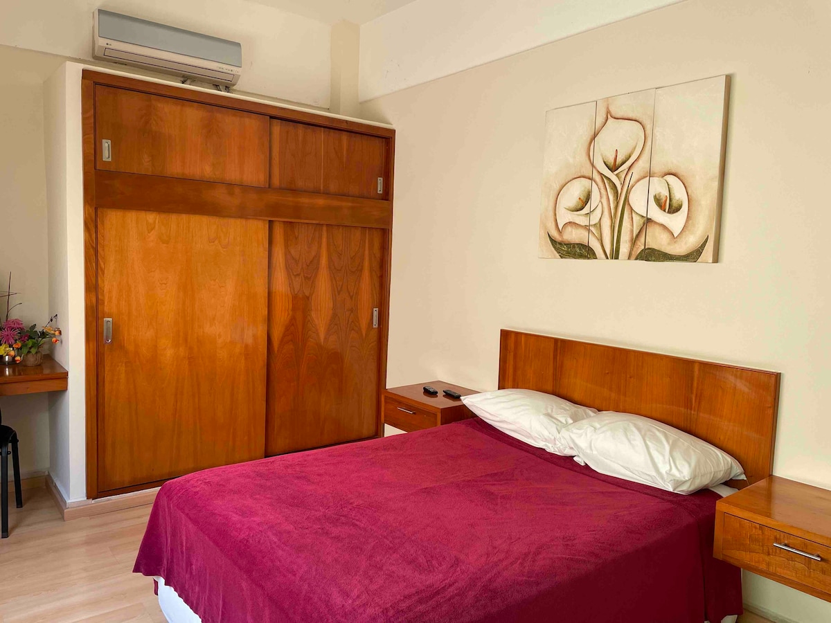 Tiefenreinigung vor jeder Buchung und Desinfektion mit COFEPRIS-zertifiziertem Produkt. Antibakterielle Gelspender in den Gemeinschaftsbereichen. Warme und gemütliche Unterkunft, geeignet für kurze Aufenthalte, kleiner Raum, alle Annehmlichkeiten wie zu Hause. Es verfügt über ein Doppelbett, ein eigenes Badezimmer, eine Klimaanlage, einen Kleiderschrank, eine Küche mit Kaffeemaschine, einen Elektrogrill, einen Kühlschrank, Geschirr, eine Mikrowelle und ein Bügeleisen. KEINE PARKPLÄTZE VORHANDEN