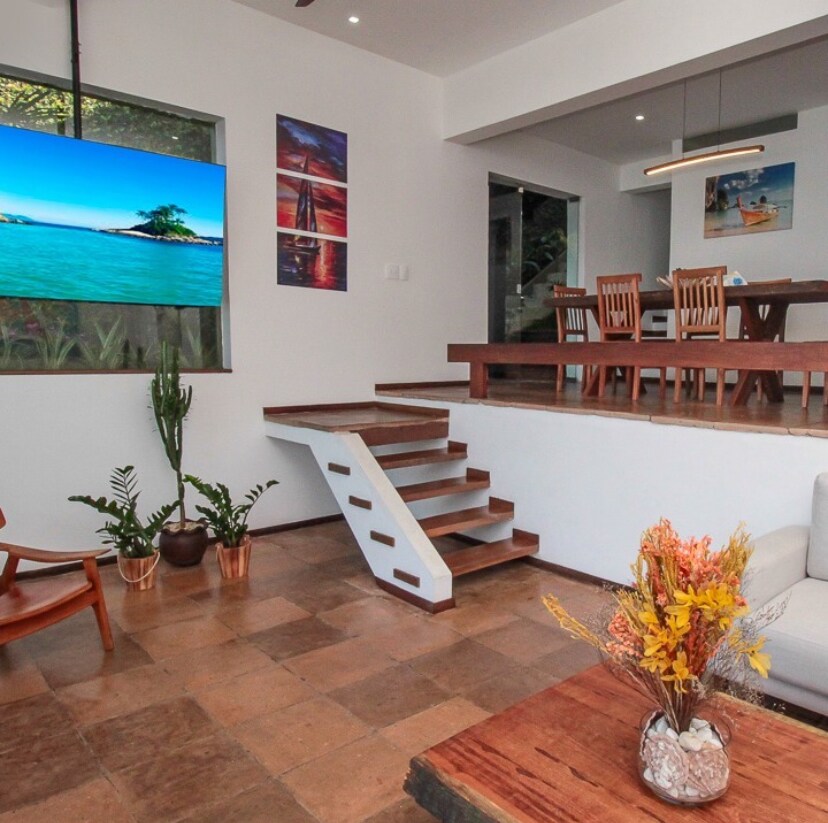 Komplettes Haus reserviert, mit schöner rustikaler Dekoration, umgeben von einheimischem Wald und mit Blick auf ein Meer mit ruhigem und kristallklarem Wasser. Toller Ort zum Schnorcheln, Kajakfahren und Schwimmen. Es verfügt über ein Deck am Meer, um den schönen Sonnenuntergang zu betrachten oder Fische und Schildkröten zu sehen. Darüber hinaus gibt es einen Spielraum mit Tischtennis und Darts. Sie werden einen unglaublichen und magischen Ort vorfinden, der vor Frieden und guter Energie strotzt. Perfekt zum Entspannen und Verbinden mit der Natur.