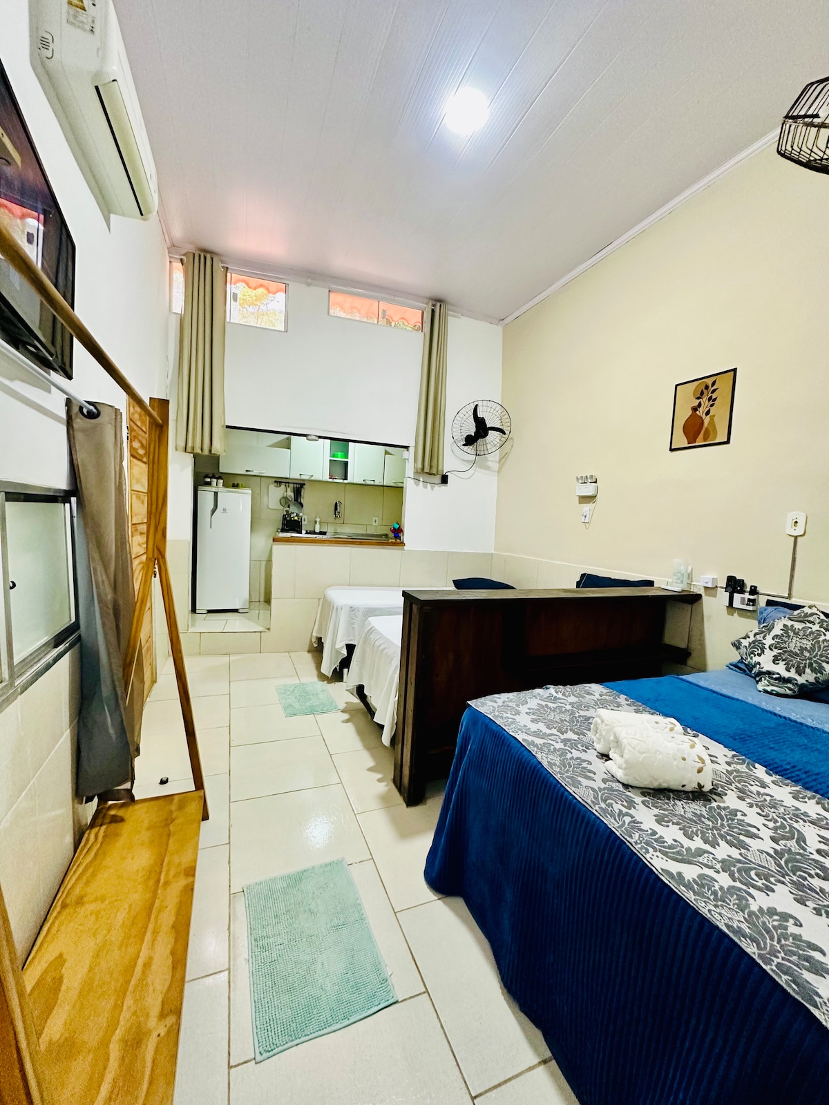 Die beste Lage!! Zentral und nur wenige Schritte vom Strand Abraão entfernt. Suite mit Küche, Außenbereich mit Dusche und Grill, alle privat. Unverwendbar!!! Fernseher, WLAN, 1 Doppelbett und 1 super gemütliches Einzelbett (wir stellen Bett- und Badwäsche zur Verfügung), Split-Inverter-Klimaanlage und Deckenventilator. Der Eingang ist individuell . Ideal für ein Paar und/oder ein Paar mit Kindern aufgrund des zirkulierenden Raums des Schlafsaals. Perfekt, um sich zu entspannen und das Beste von Ilha Grande zu genießen.