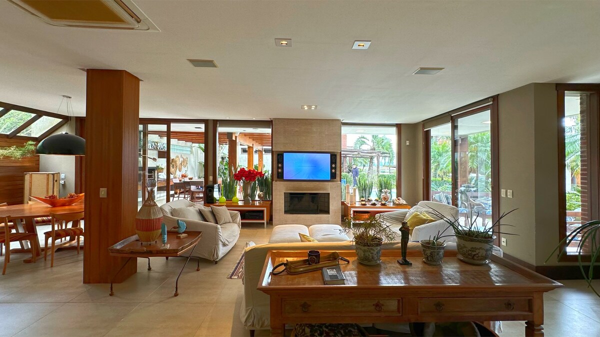 A 2 min.a pé do mar,aceita pets,infra estrut.completa,arejada,local seguro,pátio fechado,4 quartos,sendo 2 suítes,4 banheiros,wi-fi ,2 tvs sem canal aberto,salão de festas,piscina,lareira,garagem para 2 carros.Roupas de cama e mesa,todos os eletros,ventiladores.Espaço churrasqueira amplo e integrado com a piscina.Jardim amplo,câmeras externas.Voltagem 220v toda a casa. Suítes c split 9000 e 12000btus.Fora temporada check in pode ser cedo a critério do hóspede e check out pode ser as 19hs.