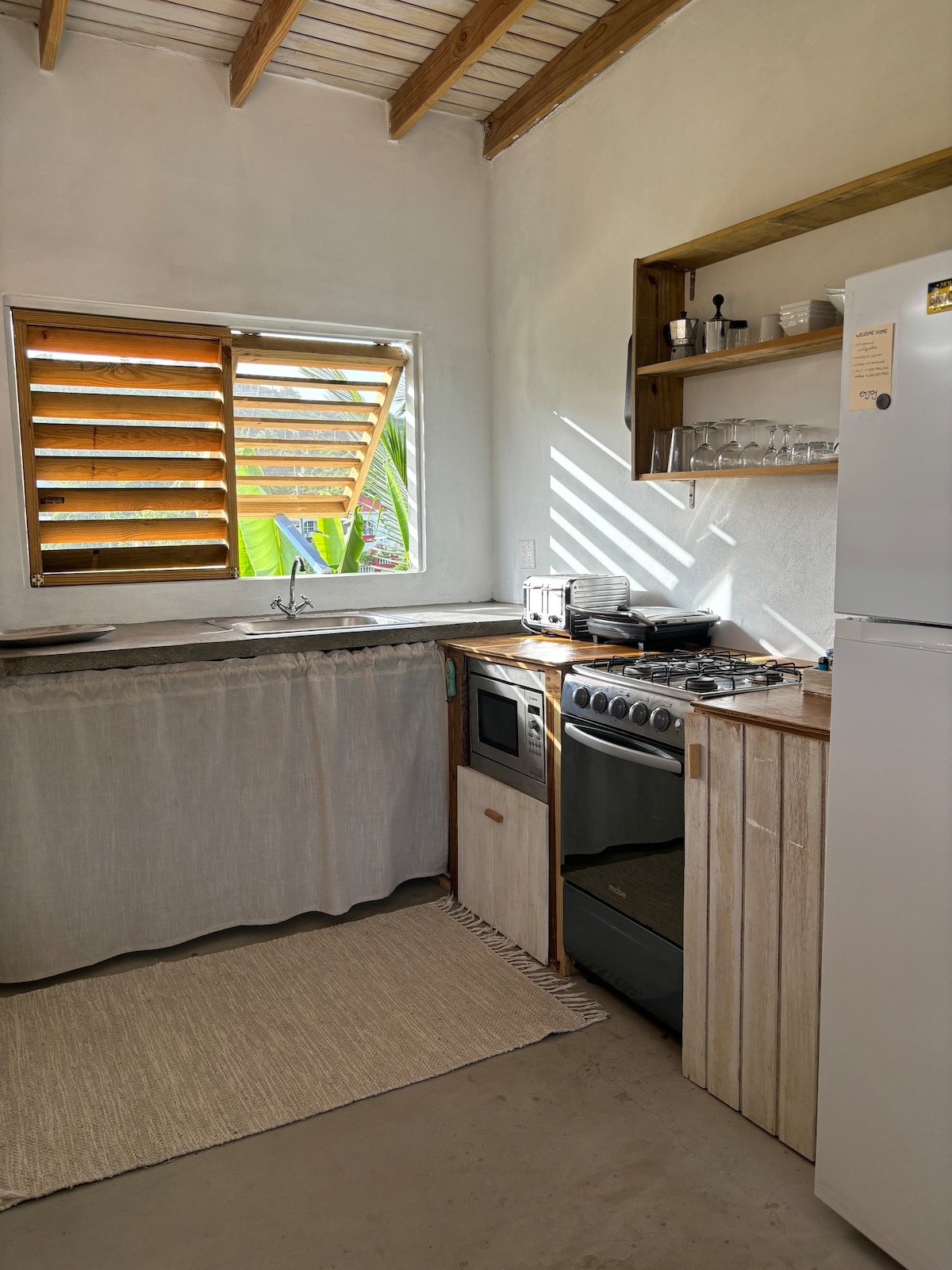 Die Holzschuppenhütte ist völlig netzunabhängig. Um die Hütte zu erreichen, ist es nur einen kurzen Spaziergang durch einen kleinen Wald auf einem schmalen, gewundenen Pfad vom Parkplatz entfernt. Die auf Stelzen gebaute Hütte bietet einen Blick auf Ackerland und Wälder mit einem langen Blick ins Tal auf die Hügel von English Harbour. Die Hütte verfügt über ein großes Schlafzimmer mit einem hölzernen Himmelbett mit Moskitonetz. Scheunentüren öffnen sich auf einen Seitenbalkon, ein Freiluftbad mit Regenwasserdusche, die durch Sonne erwärmt wird, und eine voll ausgestattete Küche. Wunderbarer Nachthimmel.