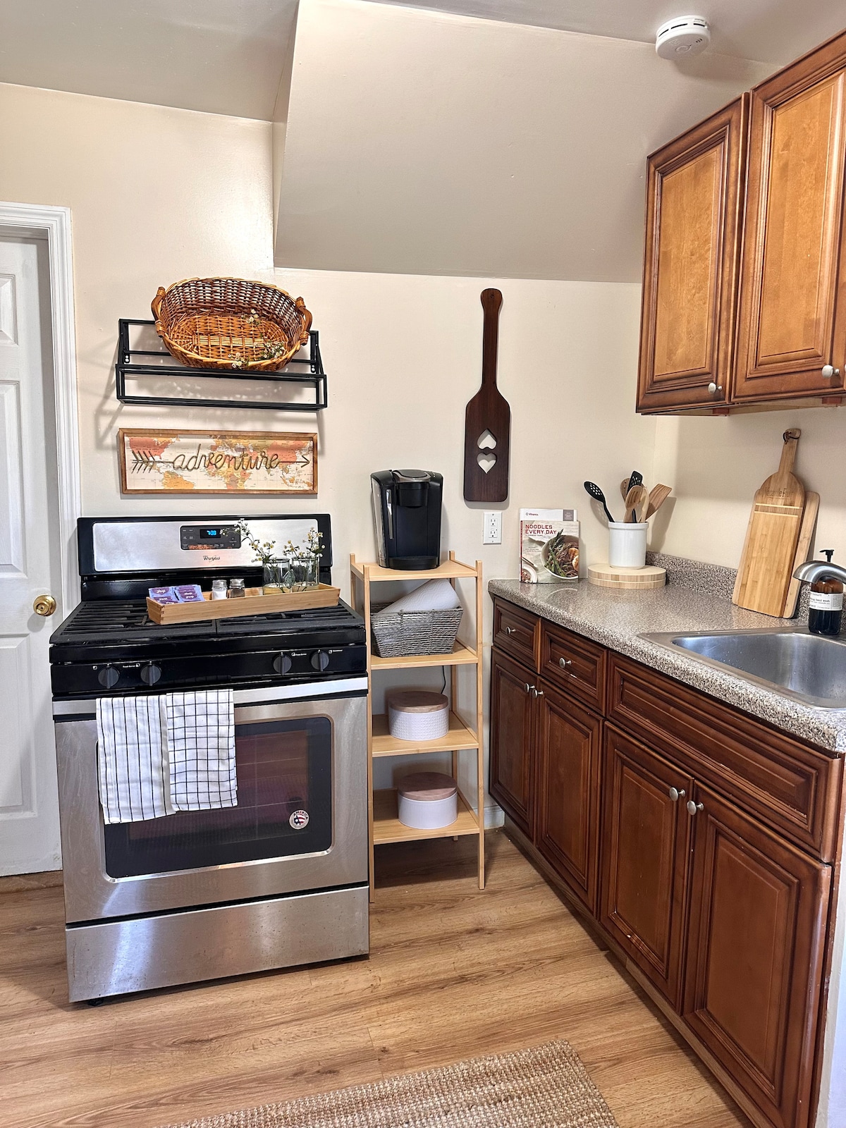 Diese private, familienfreundliche Suite verfügt über ein geräumiges Wohnzimmer, das sich zu einer abgeschiedenen Terrasse mit Feuerstelle und Essbereich im Freien öffnet – ein idealer Rückzugsort für eine kleine Familie oder ein Paar, das Ruhe und Frieden in der Nähe der Stadt sucht. Im Inneren findest du einen gemütlichen Wohnbereich mit einem Queensize-Bett, einem angeschlossenen Badezimmer, einem Schlafsofa, einem Fernseher, einem Schreibtisch und einer praktischen Küchenzeile mit einem Kühlschrank, einer Mikrowelle und einer Kaffeemaschine vor.