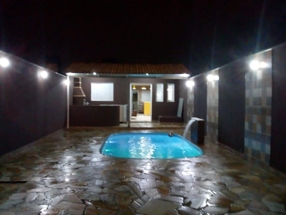 A casa conta com, sala e quarto integrados, banheiro, cozinha americana com todos os utensílios para preparo de refeições ou um churrasco, na área externa temos uma churrasqueira, pia e mesa de quatro cadeiras, uma piscina pequena (1 metro de profundidade), garagem fechada grande( 30m²) porem só cabe um carro devido a lavanderia no mesmo espaço, e jardim com plantas e arvores frutíferas, tenho um aquário e um viveiro no quintal que cuido todos os dias pela manhã.