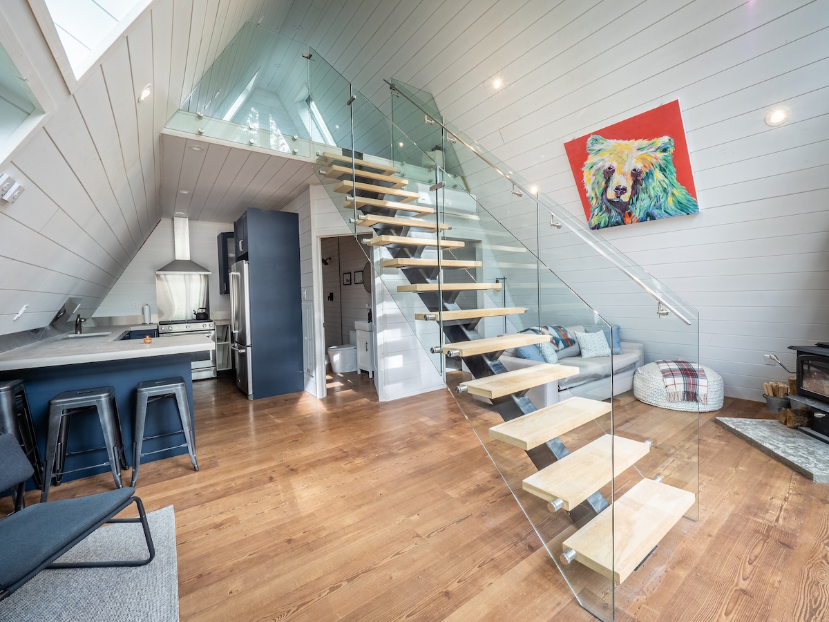 Das Eh Frame ist eine 3-stöckige, skandinavisch inspirierte Luxus-Hütte mit zwei völlig separaten Einheiten: die Sunrise- und Sunset-Suiten. Deine Gruppe hat exklusiven Zugang zur Sunrise Suite (alles auf den Fotos gezeigt), einschließlich zwei Schlafzimmern, einer Terrasse, einem privaten Spa und einer Feuerstelle. Die vordere Einheit, Sunset Suite, ist eine separate Mieteinheit. Eine vollständige Brandmauer verläuft durch das Zentrum des Hauses und sorgt für Privatsphäre und Komfort für alle Gäste. Nur wenige Minuten von Whispering Springs und Ste. Annes Spa entfernt.