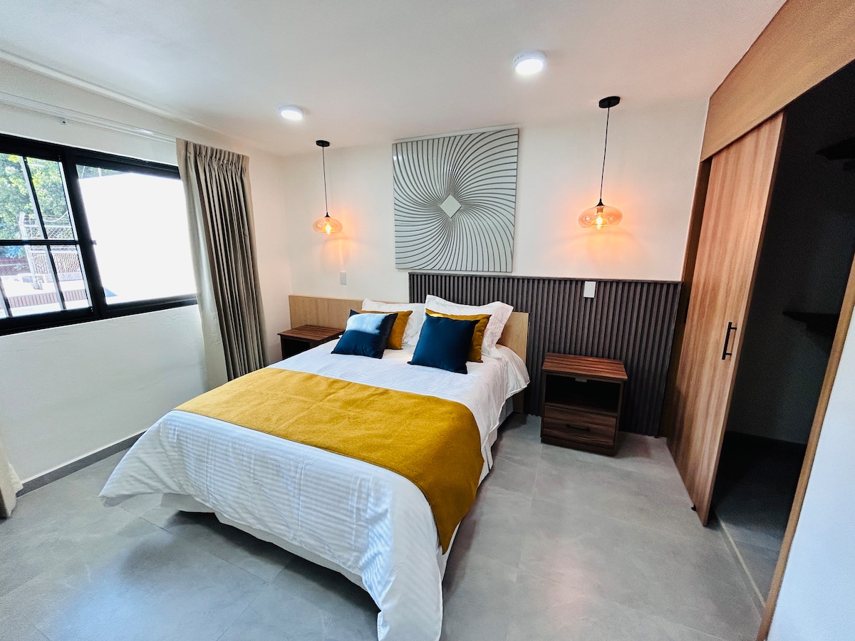 Entdecken Sie Ihr Zuhause fern von Zuhause in der Colonia Moderna! Unsere modernen Apartments bieten Annehmlichkeiten wie eine voll ausgestattete Küche, Smart-TV und Schreibtisch. Nur 5 Minuten vom historischen Zentrum, dem Agua-Azul Park und der Col. Americana! Der Flughafen ist nur 15 Minuten entfernt. Buchen Sie jetzt und erleben Sie es!