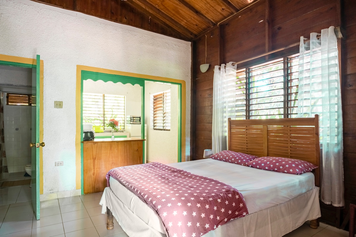 Sehr komfortable Suite mit einem Schlafzimmer, Küchenzeile, Ess- & Sitzbereichen und Veranda. Nur das Schlafzimmer ist klimatisiert und in den Zimmerpreisen enthalten. Nur etwa dreißig Minuten vom Strandstreifen und nur fünfzehn Minuten vom Hauptort entfernt . Green Acres, wo wir uns befinden, ist eine gehobene Community mit etwa fünfhundert Häusern.