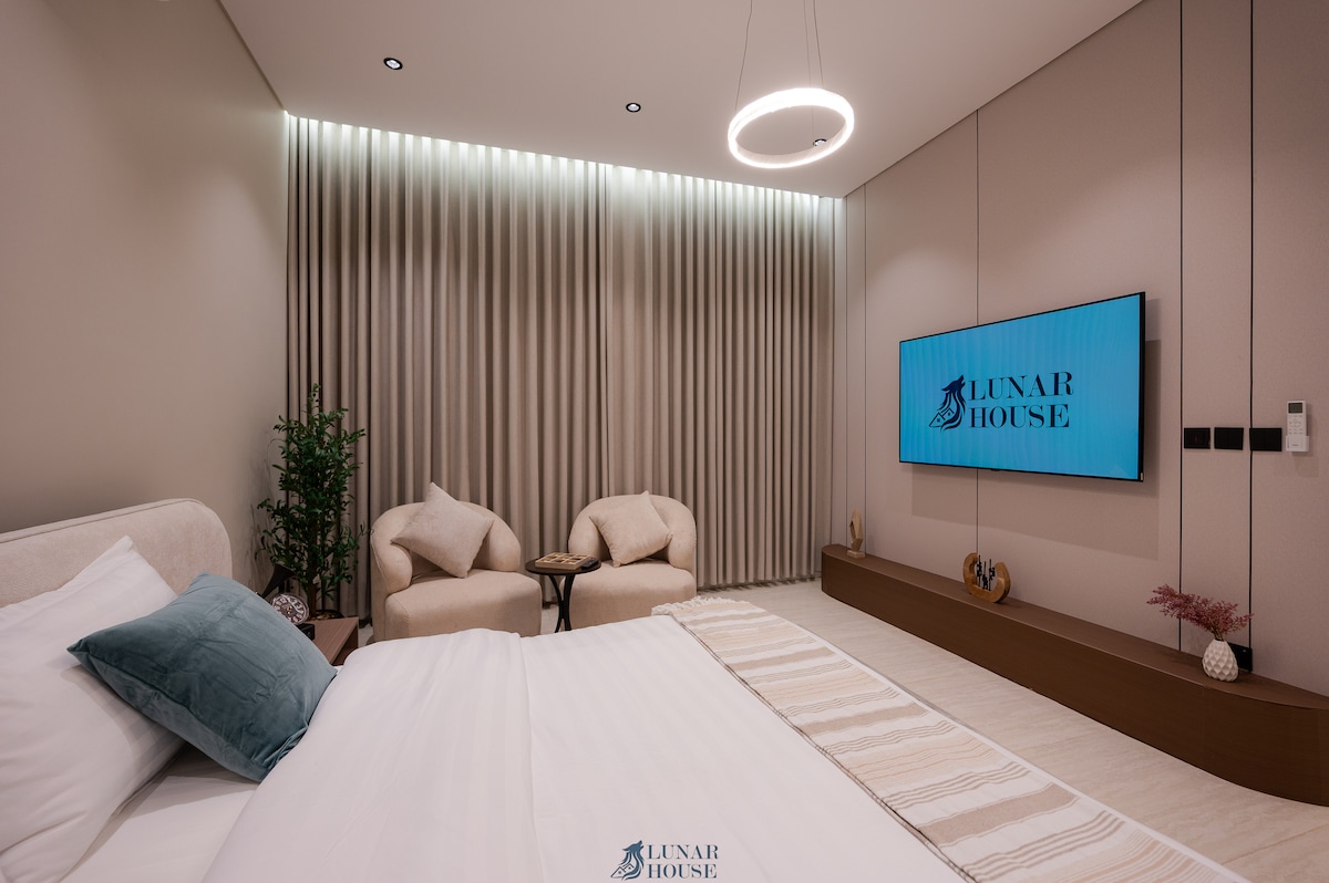 غرفة وصالة، تجربة أنيقة، دخول ذكي، شاشة 75 بوصة
