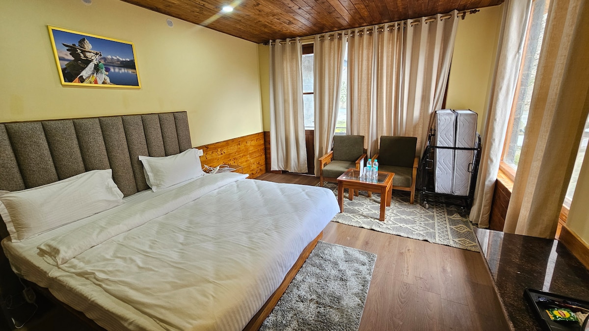 Enjoy a peaceful stay in this spacious room with stunning mountain views. The room features a comfortable king bed, cozy seating area, large windows with natural light, and a private balcony overlooking the valley and snow-capped mountains. Guests also have a modern attached bathroom with hot water, a workspace, and a TV for a relaxing stay. Perfect for couples, families, or travellers looking for a calm mountain getaway.
