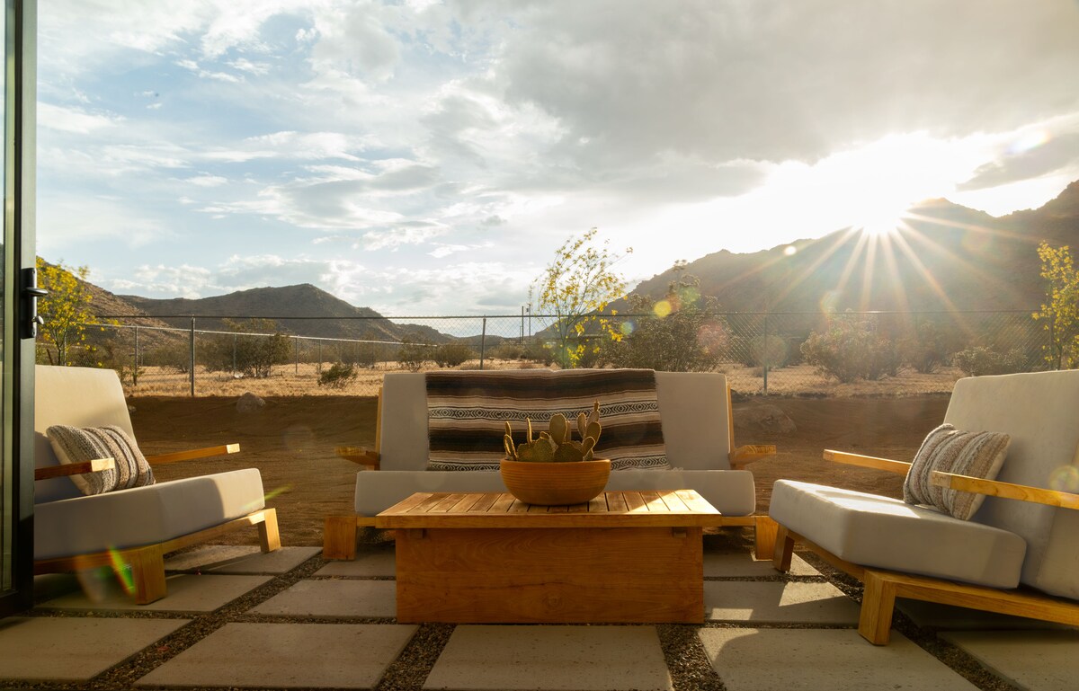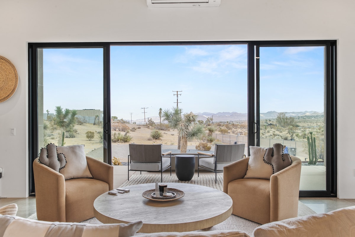 Spa-Themen-Anwesen auf 30 Acres, nur 4 Meilen vom Zentrum von Joshua Tree entfernt. Vorgestellt in Travel + Leisure, Domino, San Diego Mag und mehr. Ohne unmittelbare Nachbarn kannst du dich wirklich entspannen. Blick aus riesigen Fenstern auf über 100 Joshua Trees und den Nationalpark. Zu den Annehmlichkeiten gehören ein brandneuer Pool und eine Sonnenterrasse, eine übergroße, maßgeschneiderte Sauna, ein kalter Tauchbecken, ein Whirlpool für 8 Personen, ein separates Yoga-/Gruppenspeisegebäude, eine Außendusche, eine Küche für Köche, ein EV-Ladegerät, eine rauchfreie Feuerstelle und ein privater Discgolfplatz.