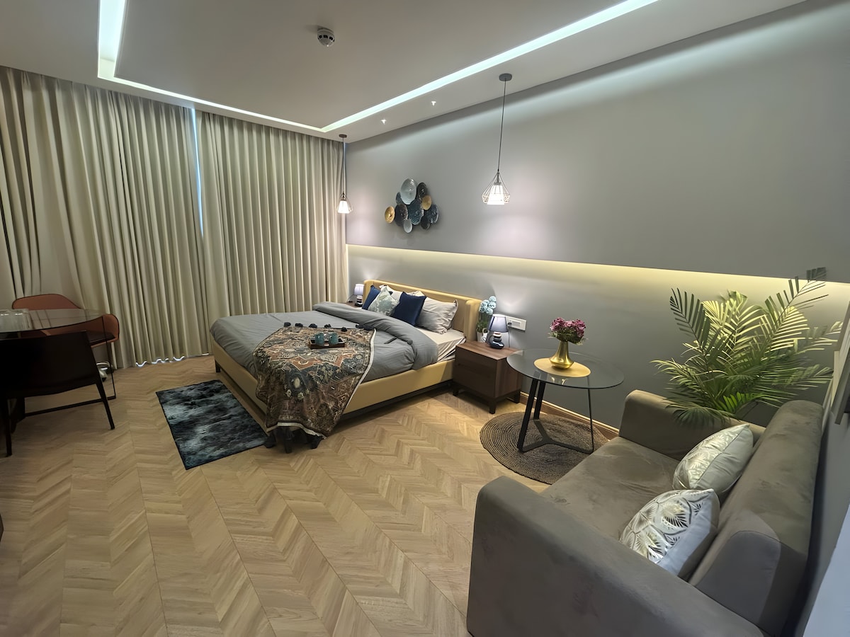 A brand-new, beautifully designed 2BHK in Baani City Centre, right next to Hotel Hilton. Enjoy a huge sunrise-view balcony, fast Wi-Fi, smart TV, comfy sofa seating, and a fully functional kitchen with microwave, induction, utensils, fridge & kettle. Safe, secure building with 24/7 hot & cold water. Market, club, bank & ATM are right downstairs. Guests can also walk to Hilton’s bakery & restaurants as non-resident visitors. Perfect for comfort, convenience & romantic vibes.