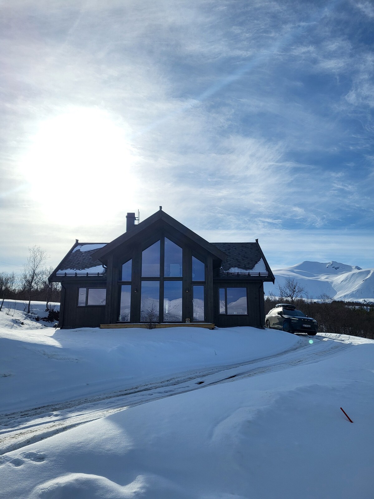 Die Hütte befindet sich in einem kleinen Hüttenbereich mit Blick auf das Meer, die Lyngenalpen und die Fjorde. Es gibt schöne Sonnenbedingungen von morgens bis abends. Es ist wunderbar, die Aussicht, den Sonnenaufgang wie den Sonnenuntergang, von innen oder auf der Terrasse draußen zu genießen. Der Winter bietet schöne Lichter, die sich den ganzen Tag über ändern. Und natürlich kannst du die magischen Nordlichter genießen, die direkt von der Hütte aus am Himmel tanzen. Hier kannst du auf eine Gipfeltour gehen, Fahrrad fahren, im Wald oder zum Meer spazieren gehen oder einfach nur bei einem Glas Wein entspannen und die Aussicht genießen.