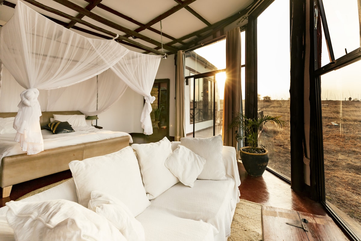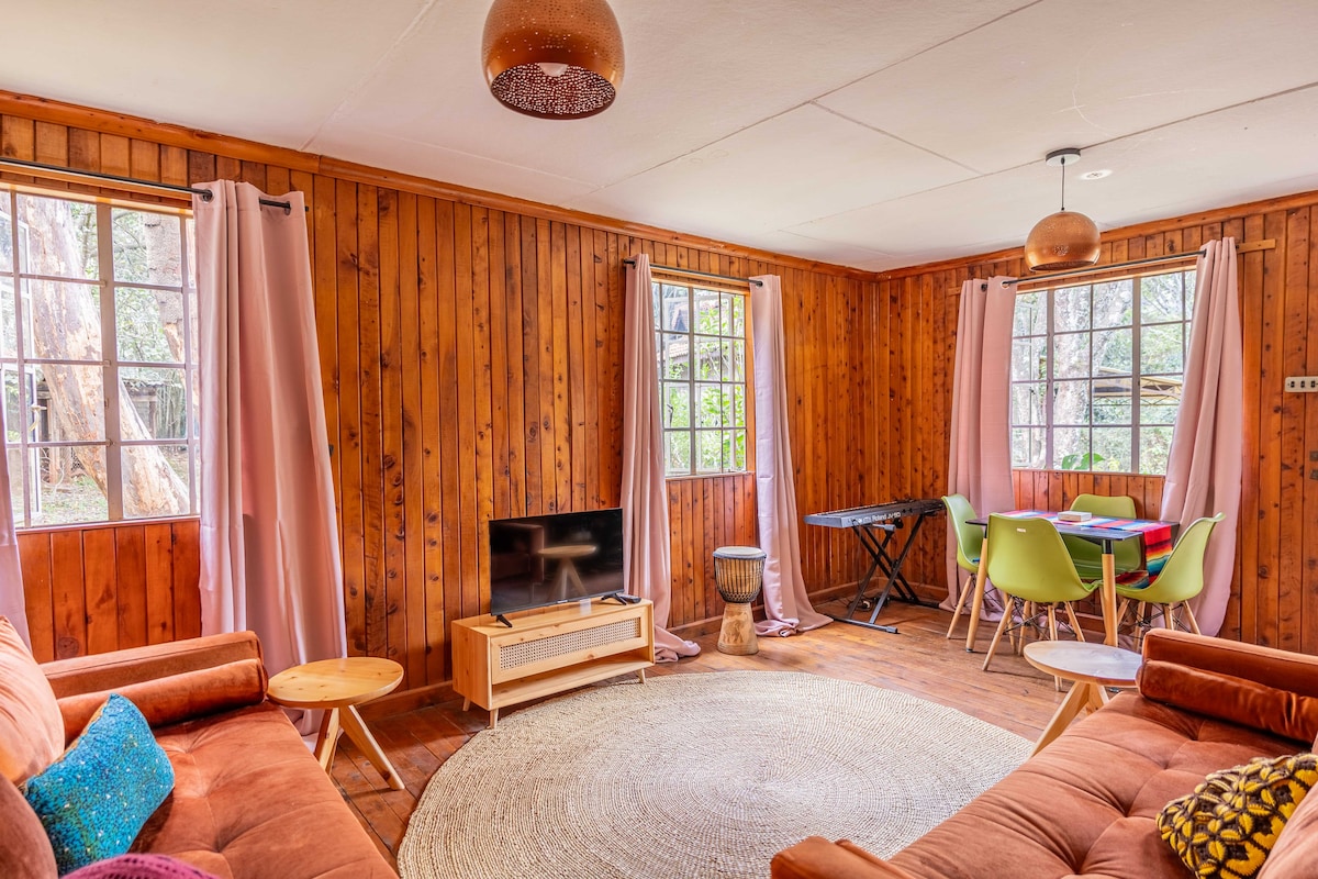 Dieses neu renovierte Ferienhaus verfügt über 2 Schlafzimmer, 2 Badezimmer, Büro, Wohnzimmer, Küche und eine große, voll möblierte Terrasse. Das Ferienhaus ist sehr gemütlich und geschmackvoll mit viel Kunst eingerichtet. Es ist von alten Bäumen und viel Laub umgeben und ist der perfekte Ort, um der geschäftigen Stadt zu entfliehen und sich in der Natur zu entspannen. Vielleicht siehst du sogar ein oder zwei Warzenschwein, wenn du dich von einem langen Tag auf der Veranda entspannst! Der Preis gilt für Selbstversorger. Komplettes englisches Frühstück für 20 US-Dollar pro Person pro Tag.