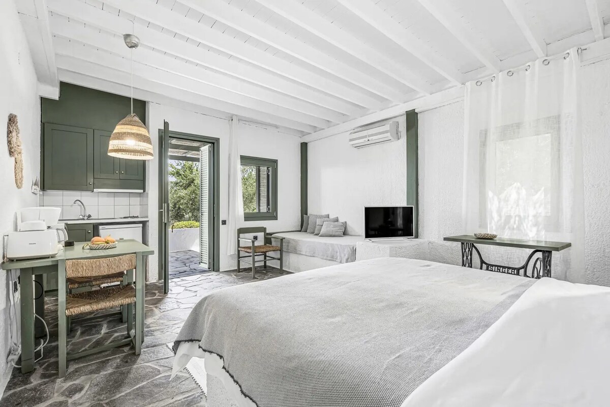 Unser Gästehaus besteht aus 4 identischen Studios mit viel Privatsphäre. Jedes Studio verfügt über ein komfortables Boxspring-Doppelbett, 2 begehbare Kleiderschränke, ein eigenes Badezimmer mit Dusche und WC, eine Küchenzeile und eine Klimaanlage. Draußen hat jedes Studio eine große überdachte Veranda und eine offene Terrasse mit 2 Sonnenliegen. Das frische und gesunde Frühstück wird im Gemeinschaftsgarten serviert, wo du auch eine Außendusche und eine Hängematte findest. Der Sandstrand und die Taverne sind nur wenige Gehminuten entfernt.