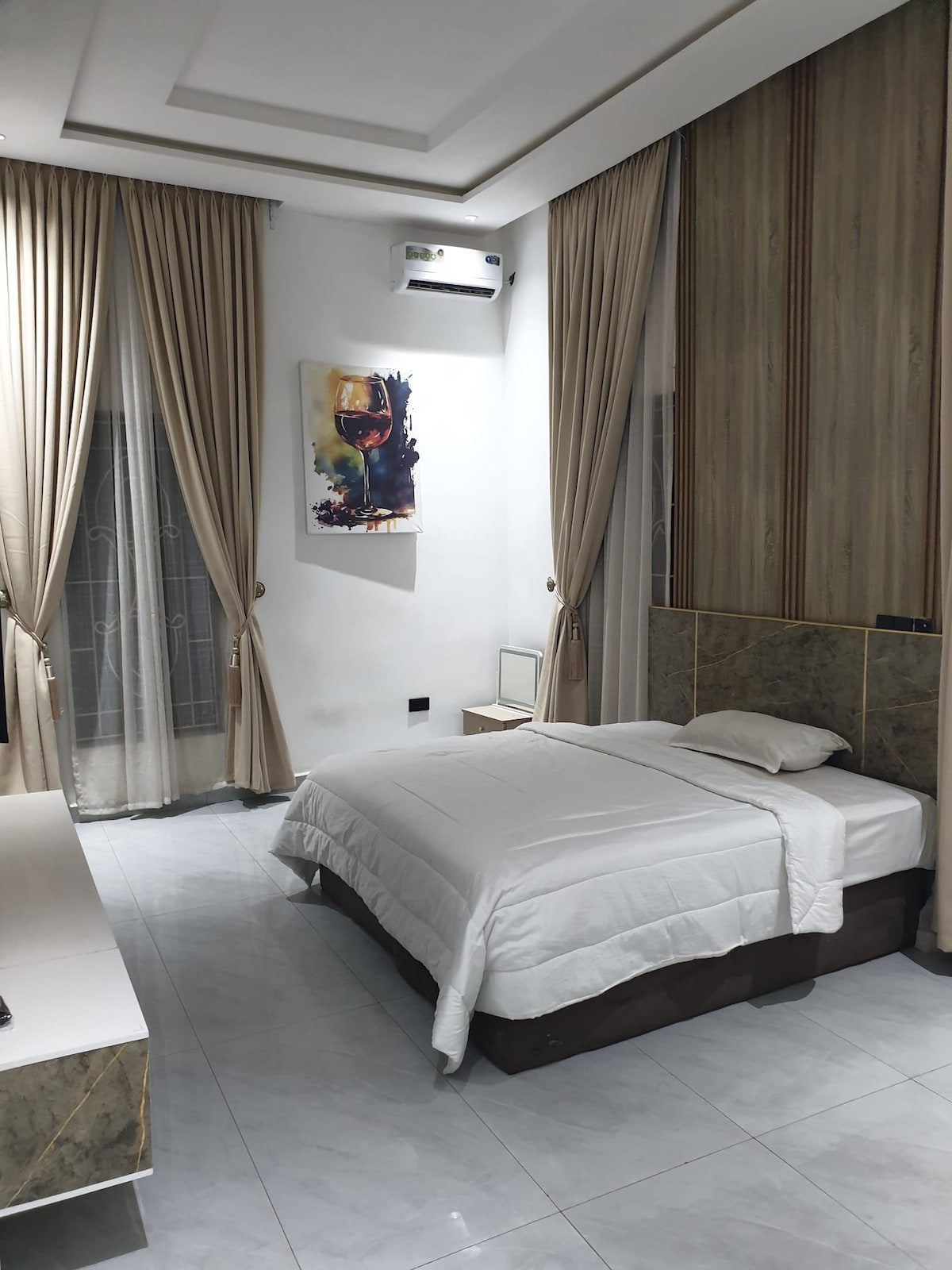 Stilvolle 2-Zimmer-Wohnung mit einem 65-Zoll-Smart-TV, Netflix, kostenlosem WLAN und einer Mini-Weinbar. Genieße zwei komfortable Schlafzimmer, eine Küchenzeile mit Mikrowelle, Kühlschrank, Gasherd und 9-kg-Waschmaschine. Das Hotel liegt im sicheren Gaduwa Estate, nur wenige Minuten vom Gaduwa Shopping Plaza, den Geschäften und Cafés entfernt. Perfekt für Geschäfts- oder Urlaubsaufenthalte, kombiniert dieses gemütliche Haus Komfort, Bequemlichkeit und eine ruhige Umgebung für ein entspannendes Abuja-Erlebnis. Wir freuen uns darauf, dich bei uns zu begrüßen. 😊