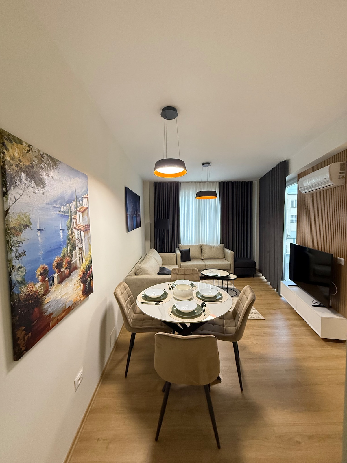 ☀️Mit 180 Grad Panoramablick von Ost nach West. Die Wohnung ist 7,9 km vom Flughafen TIA ✈️und 8,8 km vom Zentrum von Tirana entfernt🌇. Sie ist leicht im Zentrum von Kamza Town zu finden, die Hauptstraße, die nach Tirana führt. Im ersten Stock befinden sich eine Reihe von Einrichtungen wie Bank, Wechselstube, Supermärkte, Cafés, Apotheken, Bushaltestellen usw. Leicht zu besuchende Orte sind Boville Lake, Kruja Castle, Preza Castle das Zentrum von Tirana. Der Aufzug wird ab der 3. Etage genommen. (1,2 Etagen sind Geschäftsräume)