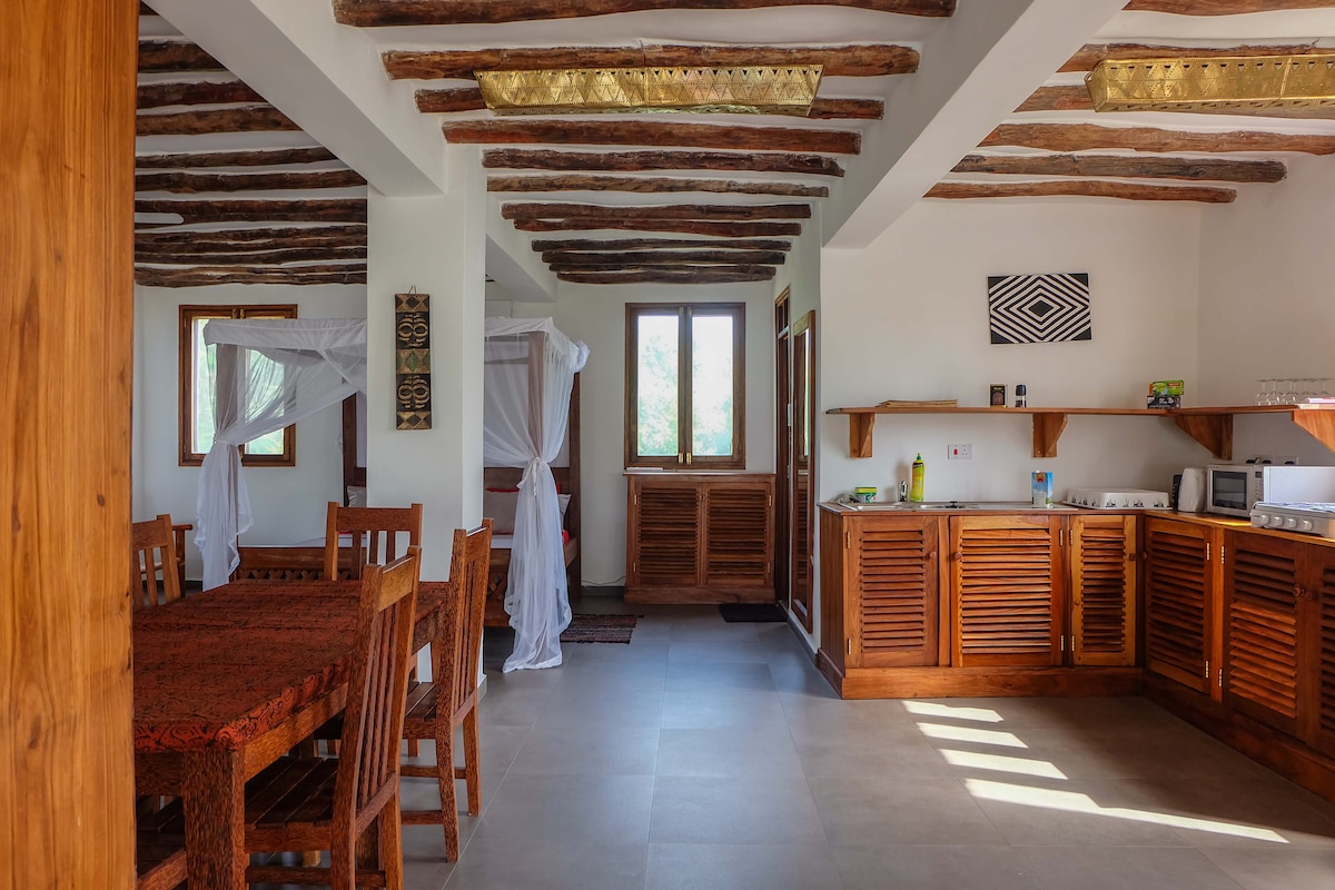 Willkommen bei uns zu Hause! Wenn du auf der Suche nach einem ruhigen und friedlichen Aufenthalt in Privatsphäre auf dem Land bist, wirst du nicht enttäuscht sein. Unser Haus liegt 2,5 km nördlich des Dorfes Bwejuu, auf einem Hügel, nur 3 Gehminuten vom Indischen Ozean entfernt. In jedem Zimmer befindet sich ein Deckenventilator. Es gibt 2 geräumige Schlafzimmer und ein Wohnzimmer. Die Küche ist modern. 1 Badezimmer. Eine Dachterrasse mit Sonnenliegen unter den Palmen und einer geschätzten Außendusche. Erfrische dich in unserem neuen Pool! Kostenloses WLAN
