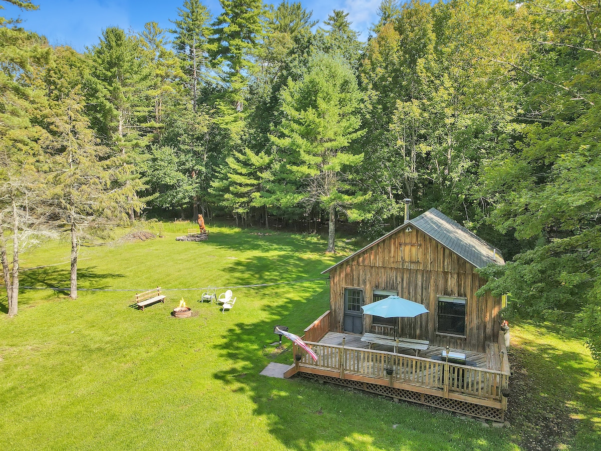 Private und abgeschiedene Smallwood-Kabine für 6 Personen. Zentrale Klimaanlage. Parken & Hören Sie den Bach fließen, wenn Sie einfahren. Großes tolles Zimmer mit Kamin & Fenstern mit Blick auf den Hinterhof-Bach. 1 Hauptschlafzimmer, 1 separates Gästezimmer, 1 offenes Schlafloft (2 Einzelbetten) Genießen Sie die Abende an Deck oder an der Feuerstelle im Freien und lauschen Sie dem Bach, der zu einem kleinen Wasserfall führt. Genieße die Schwimmgrube direkt in deinem Garten! Außendusche! In der Nähe von Bethel Woods, Wandern, White Lake, Toronto Reservoir