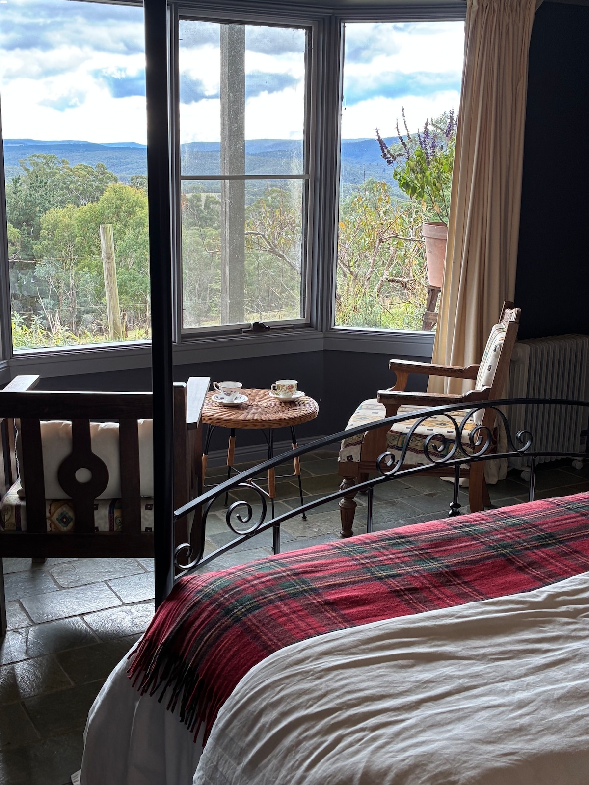 Stunning view of the Blue Mountains from this unique property full of character and charm Just like walking into a fairy tale ! Surrounded by stunning countryside on this 200 acre property Fantastic open log fireplace sits at the heart of this home and an outdoor firepit and bath that overlooks the Blue Mountains makes for a special experience. Ideal romantic getaway for 2 or catch up with friends and family sleeping up to 4 adults. Feed the animals experience available at extra cost .