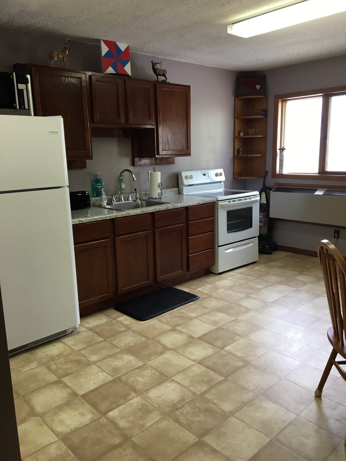 Wir nennen diese ländliche Fläche das Highway House. Es befindet sich auf dem Land mit reichlich Parkplätzen. Es ist auch wunderbar zugänglich zu zahlreichen Jagdgebieten für Jäger. Es liegt innerhalb von 10 Meilen zum Kirwin Wildlife Refuge und es gibt großartige Jagdmöglichkeiten für Hirsche, Fasane und andere Wildtiere in der Nähe. Das Haus befindet sich direkt an der Autobahn 36, sodass die Straßen immer zugänglich sind. Großer Flachbildfernseher mit ROKU und WLAN sind vorhanden. Mehrere Liegesessel im Wohnzimmerbereich.
